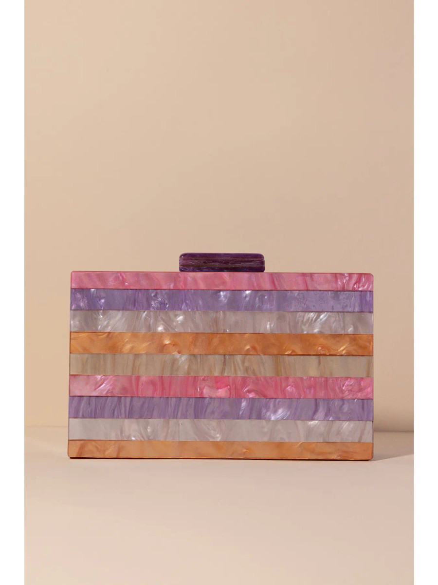 Box-type bag made of mother-of-pearl acrylic with a multicolored design drawing geometric lines in shades of cream.