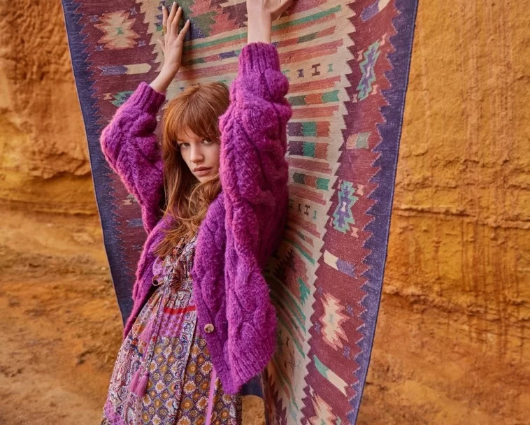 Short and wide cardigan with twists cable knit, drop shoulder and flattering V-neckline. Length : 58cm Size S